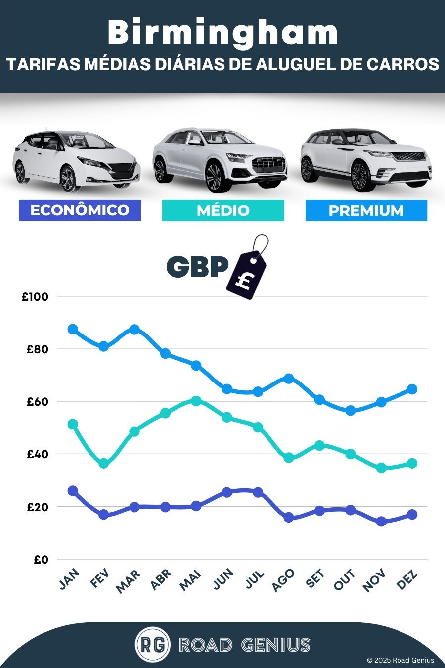 Em média, o aluguel de carros em Birmingham custa cerca de €45 por dia, com as opções mais baratas a partir de €14 por dia.