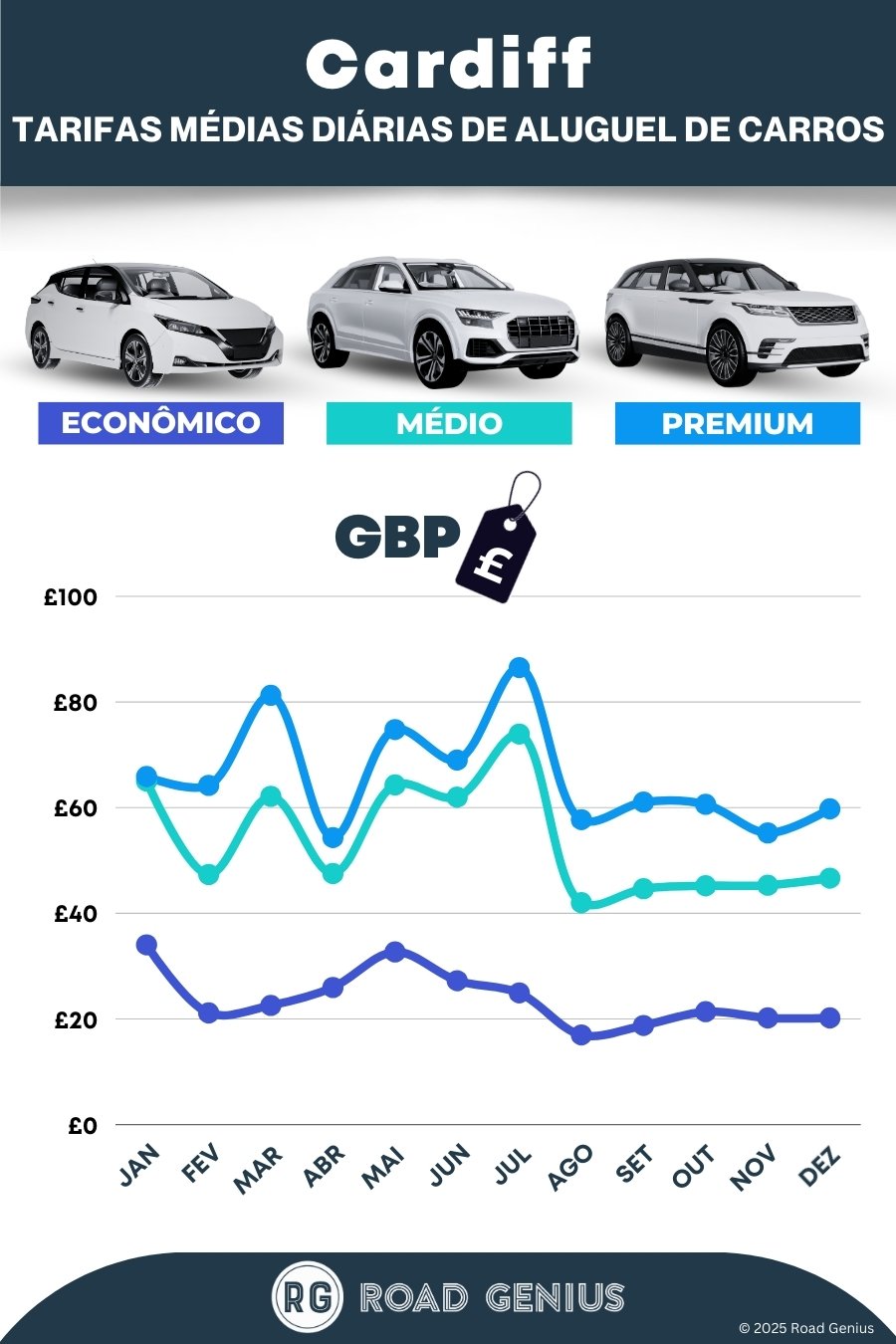Em média, o aluguel de carros em Cardiff custa cerca de €48 por dia, com as opções mais baratas a partir de €17 por dia.