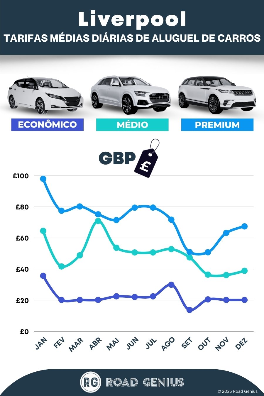 Fique de olho nas datas de pico: em Liverpool, os preços sobem de junho a agosto, nos fins de semana com jogos da Premier League e na semana da corrida de cavalos Grand National. Se possível, antecipe ou adie a retirada/devolução em um dia para evitar os picos de preço.