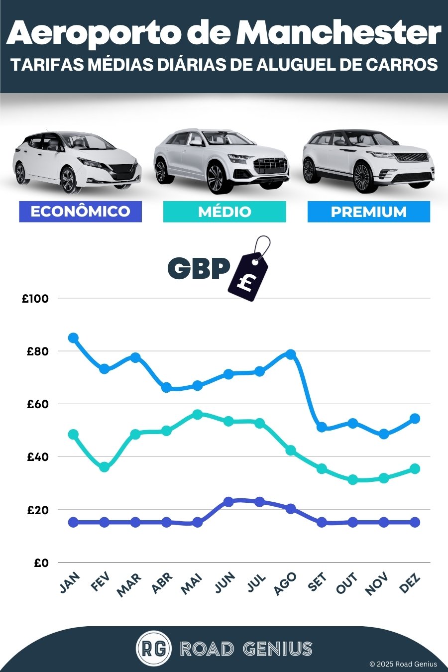 Em média, o aluguel de carros no Aeroporto de Manchester custa cerca de €42 por dia, com as opções mais baratas a partir de €15 por dia.