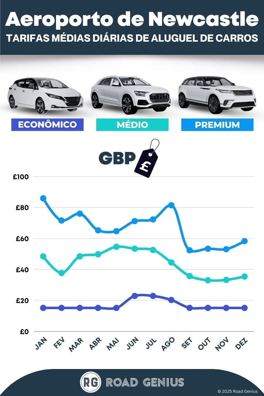 Em média, o aluguel de carros no Aeroporto de Newcastle custa cerca de €55 por dia, com as opções mais baratas a partir de €12 por dia.