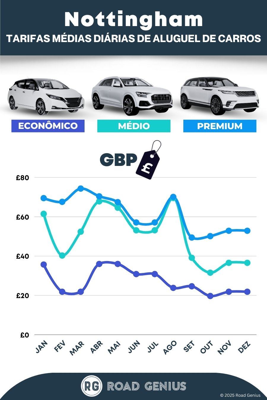 Em média, o aluguel de carros em Nottingham custa cerca de €46 por dia, com as opções mais baratas a partir de €20 por dia.