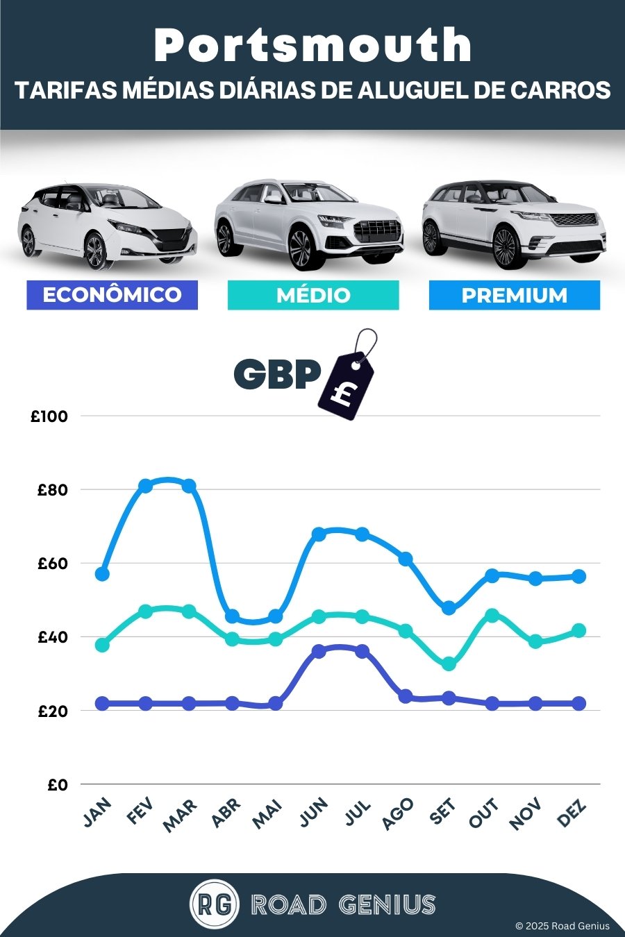 Em média, o aluguel de carros em Portsmouth custa cerca de €42 por dia, com as opções mais baratas a partir de €22 por dia.