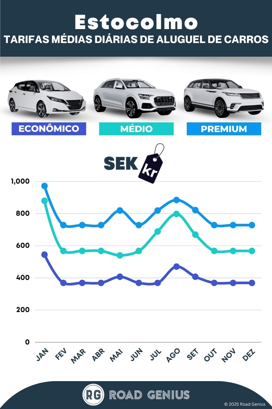 Em média, o aluguel de carros em Estocolmo custa cerca de 604 kr por dia, com as opções mais baratas a partir de 369 kr por dia.