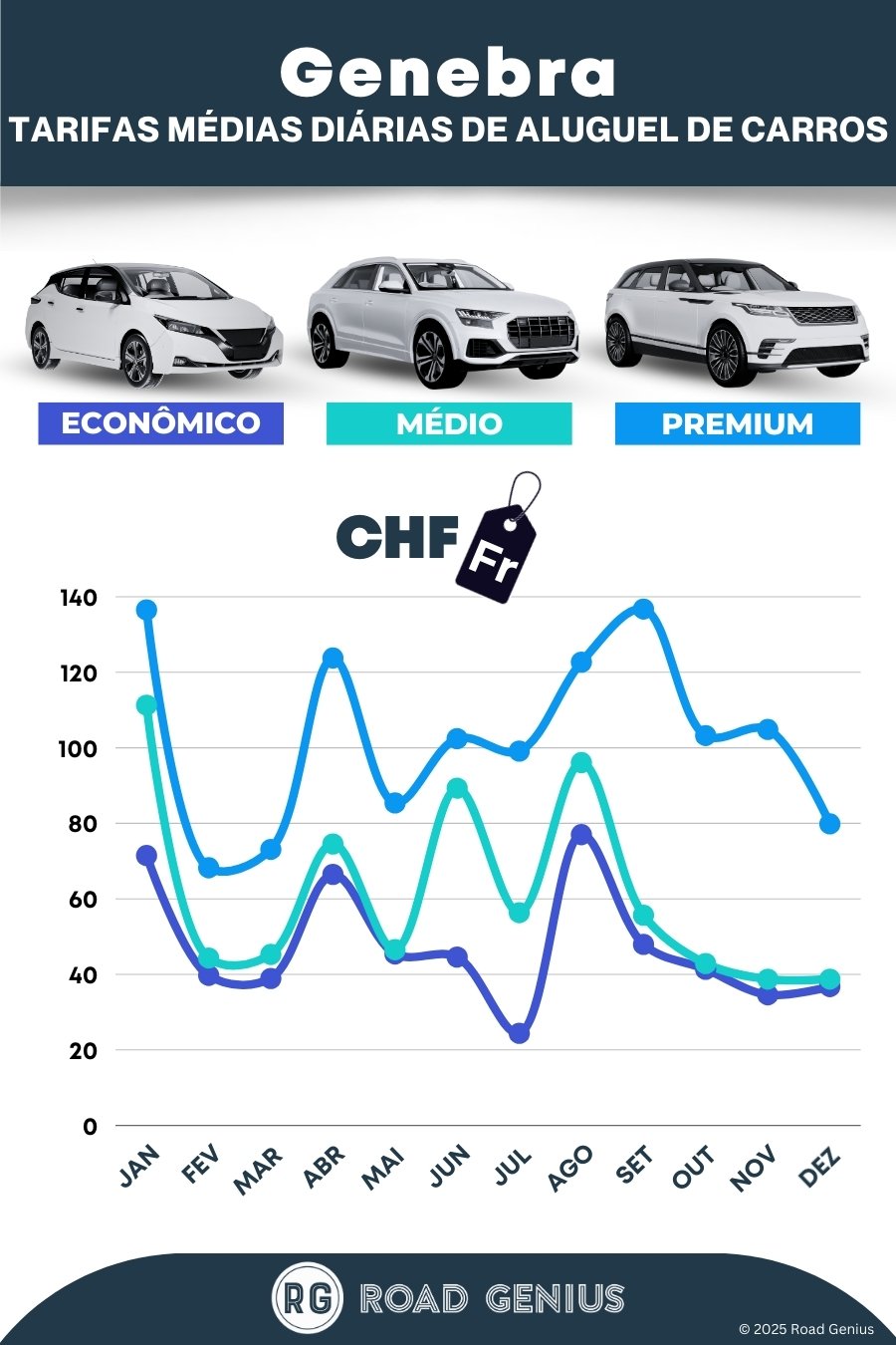 Em média, o aluguel de carros em Genebra custa cerca de CHF 71 por dia, com as opções mais baratas a partir de CHF 24 por dia.