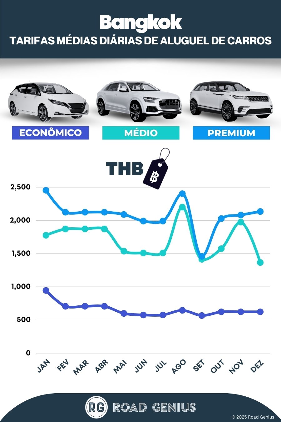 Em média, o aluguel de carros em Bangkok custa cerca de THB฿2 150 por dia, com as opções mais baratas a partir de THB฿566 por dia.