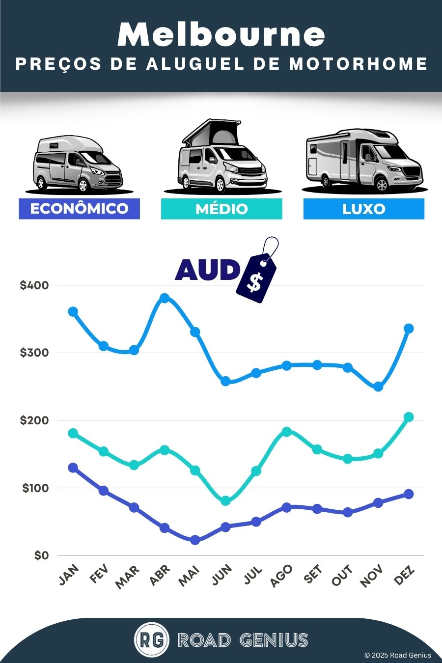 Compare ofertas de aluguel de motorhomes de várias locadoras na Austrália no Road Genius e encontre o veículo ideal para a sua viagem em um só lugar. Melbourne é um dos principais pontos de retirada e um excelente ponto de partida para explorar a Great Ocean Road, a região vinícola de Yarra Valley, a Phillip Island e os Alpes Australianos. Com clima ameno o ano todo, a região pode ser explorada em qualquer estação.