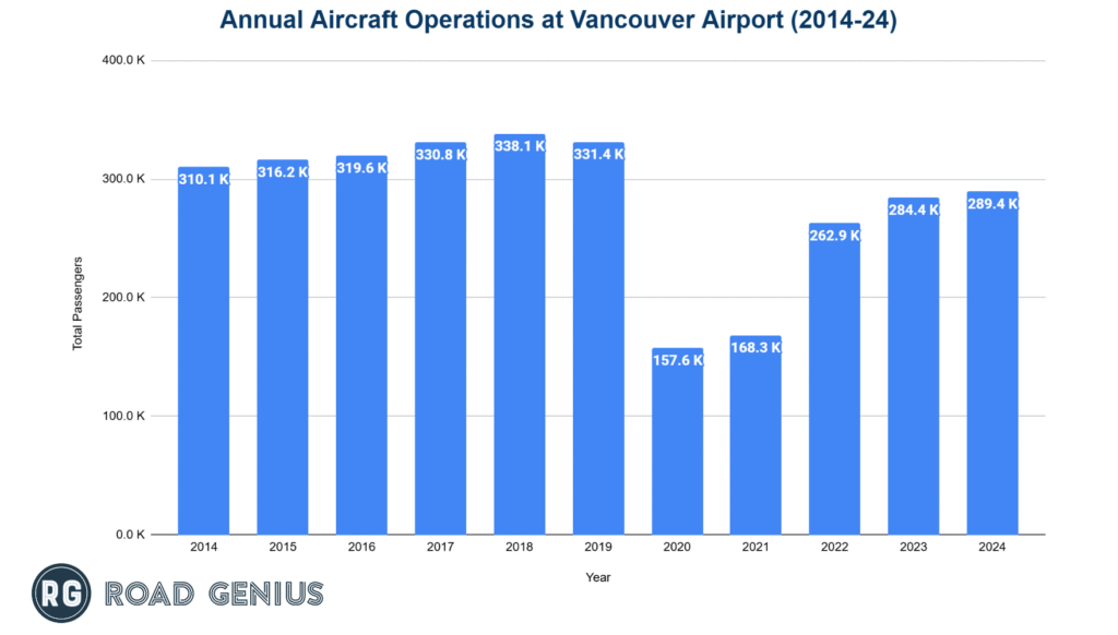 Vancouver International Airport is still recovering in terms of aircraft operations and in recent years the airport is managing over 280,000 operations annually.