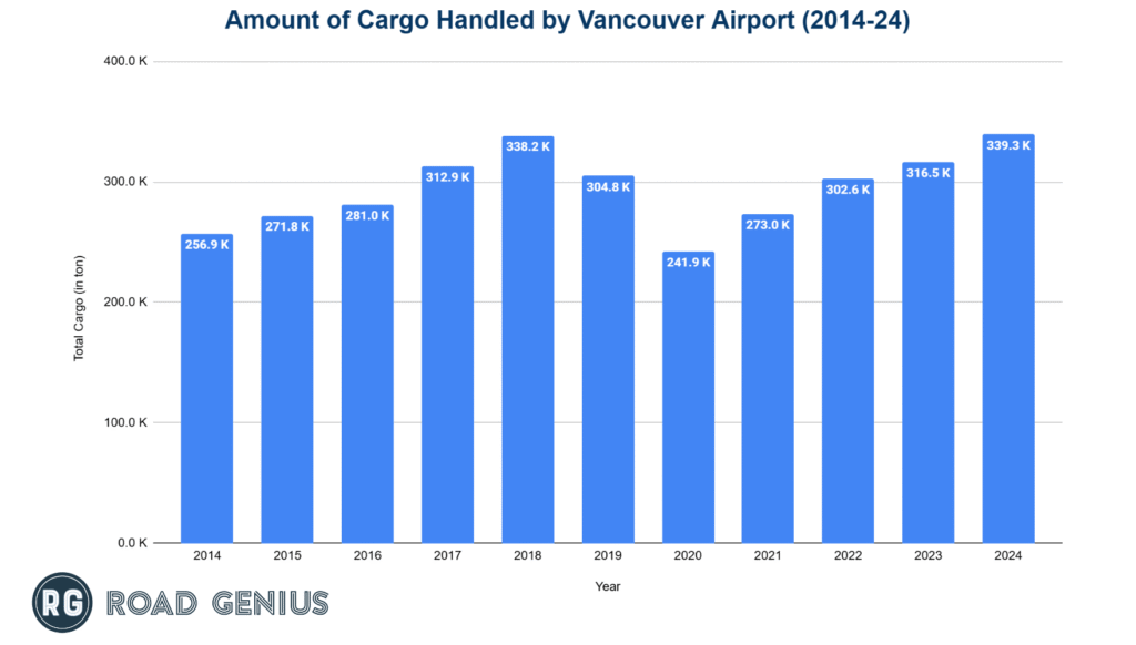 Vancouver International Airport reached record cargo volume in 2024, processing 339,276 tonnes of cargo, a 7% increase YoY (316,485 tonnes in 2023).