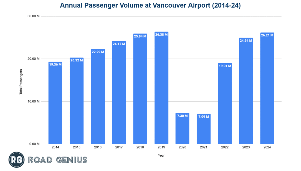 Vancouver International Airport processes approximately 25 million passengers annually, and reached 26 million passengers in 2024 (as well as previously 2018 and 2019)..