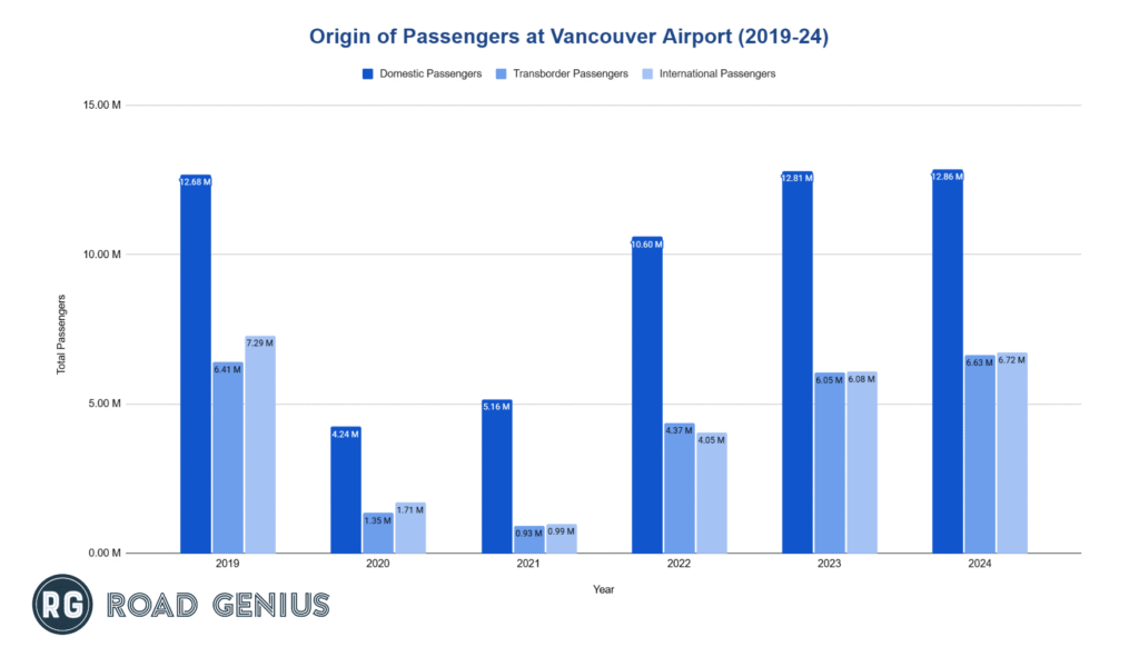- Transborder (U.S.) passengers reached 6.63 million in 2024 (25.2% of traffic).