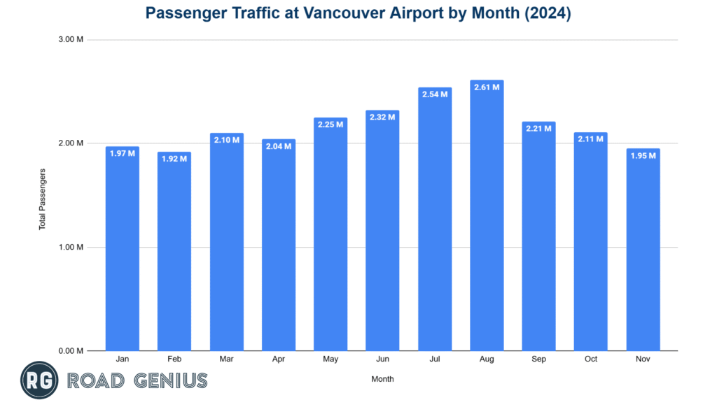 Vancouver Airport (YVR) experiences seasonality; summer months drive peak volumes.