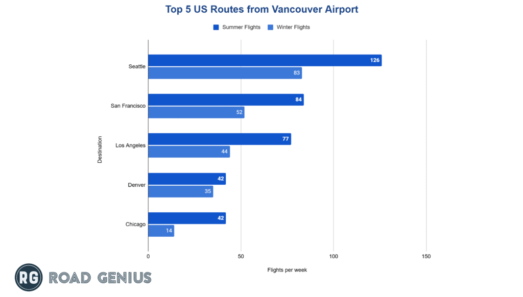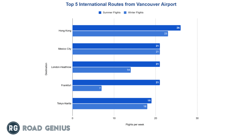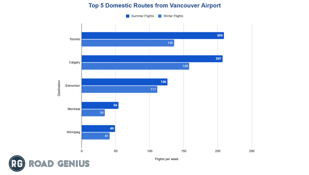 - Toronto (YYZ) leads as the busiest domestic route from YVR, with 209 summer flights and 136 winter flights per week on average in 2024/25.