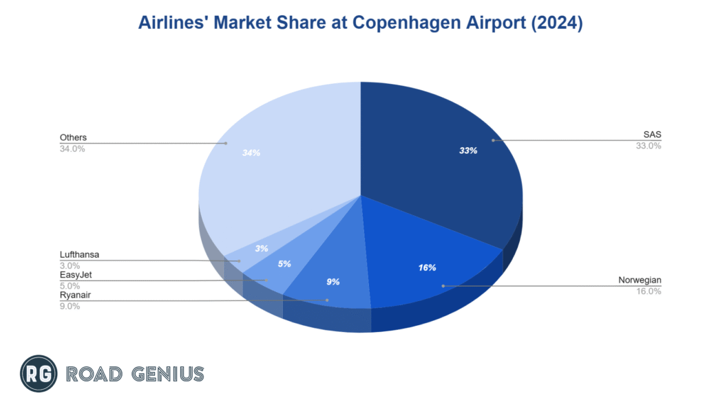 - SAS is the airport’s largest carrier at CPH, representing 33% of total passenger traffic in 2024.