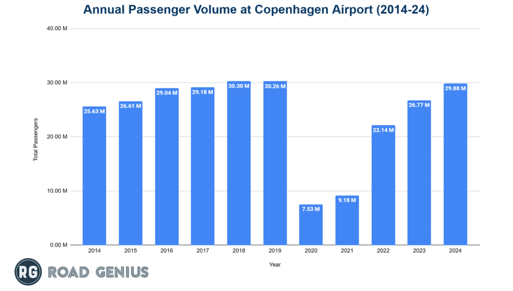 - In 2024, CPH processed 29.88 million passengers, an 11.6% increase YoY. This was a recovery to 98.7% of pre-pandemic levels.