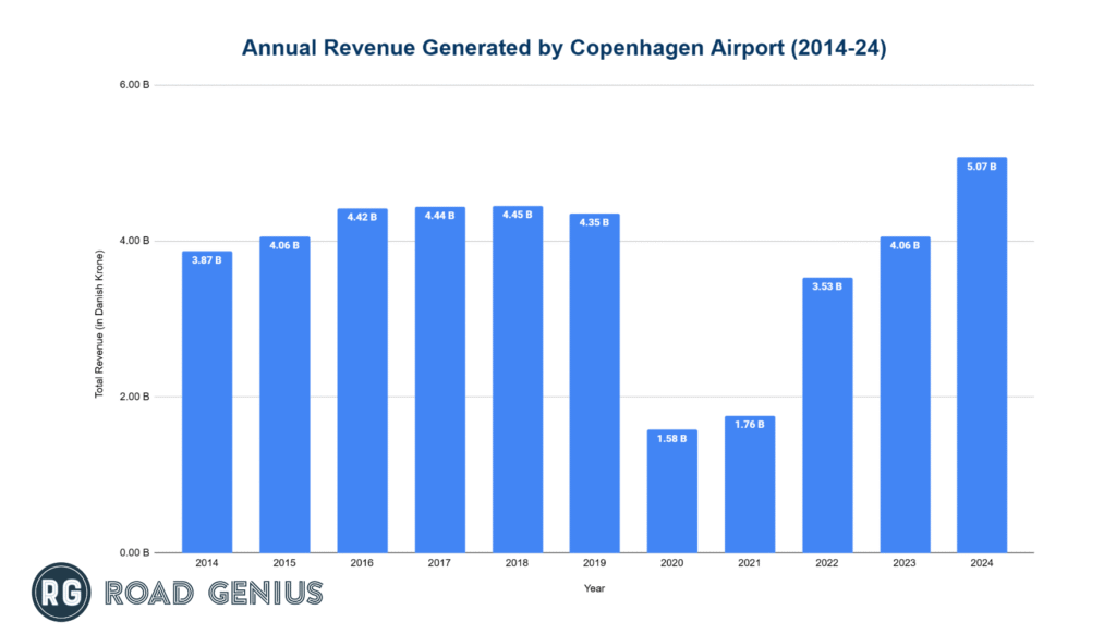 - The airport generated 4.35 billion DKK in total revenue in 2019, which fell by 63.7% to 1.58 billion DKK in 2020 due to the pandemic.