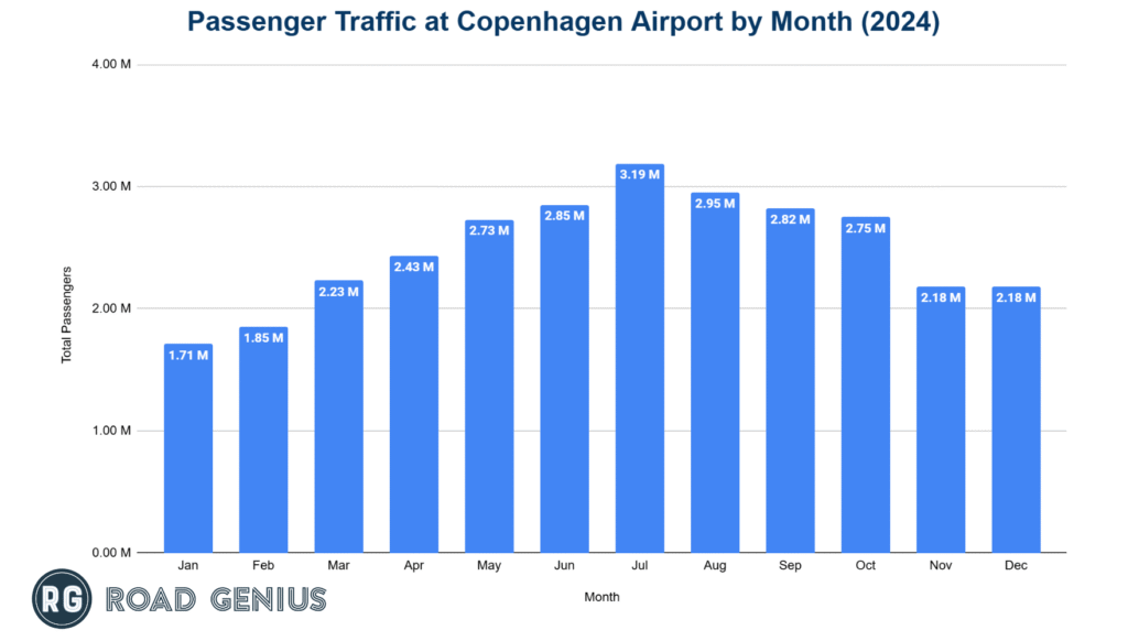 Copenhagen Airport shows seasonal patterns. Peak travel occurs in the summer.