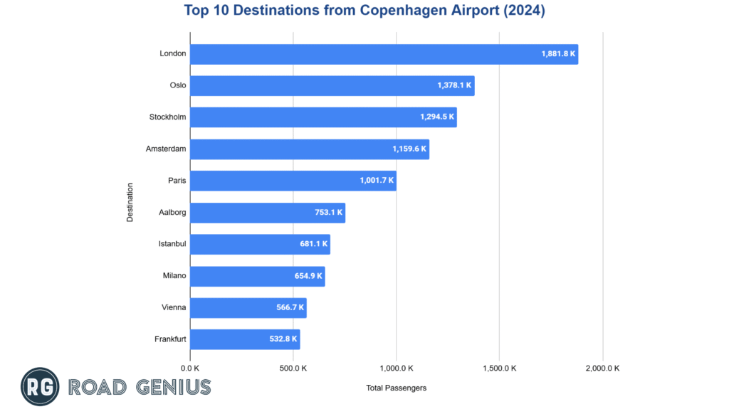 - The most popular destination from Copenhagen Airport in 2024 was London (1.88 million passengers).