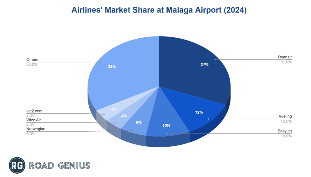 - Ryanair led in 2024 with 7.7 million passengers and a 31% market share