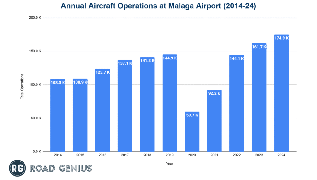 Málaga Airport manages around 150,000 aircraft operations annually.