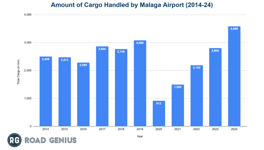 Málaga Airport handles over 3,000 tonnes of cargo annually.