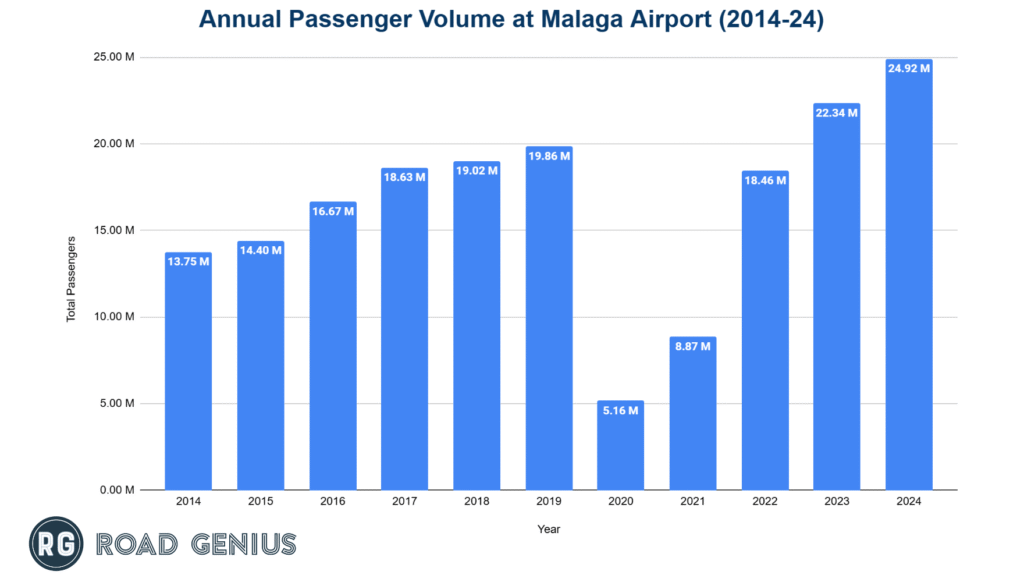 - Malaga Airport (AGP) processed 24.92 million passengers in 2024. This was an 11.5% increase YoY and a new all-time record.