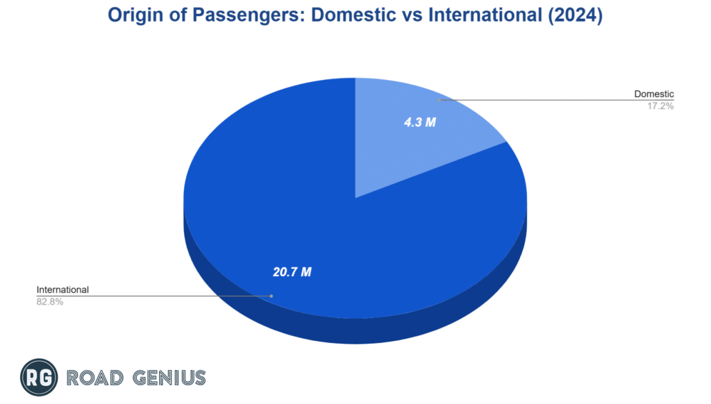 - International travelers reached 20.7 million in 2024, accounting for 83% of total traffic, up 13% YoY.