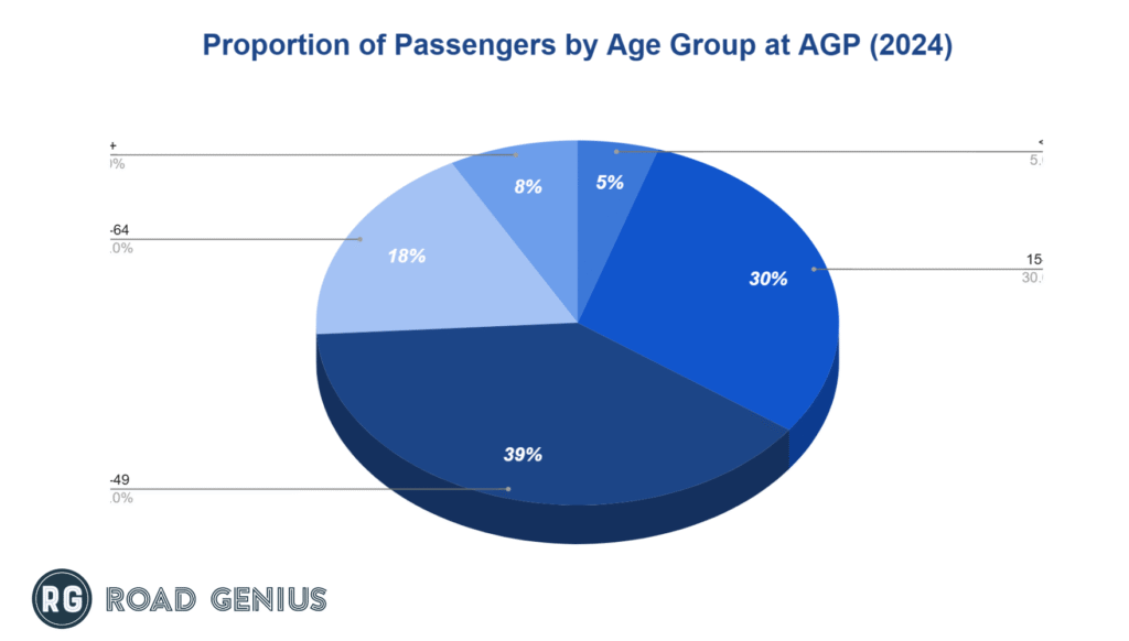 - 39% of travelers at Malaga Airport in 2024 were in the 30-49 age bracket. 30% were aged 15-29 and 18% were 50-64 years old.
