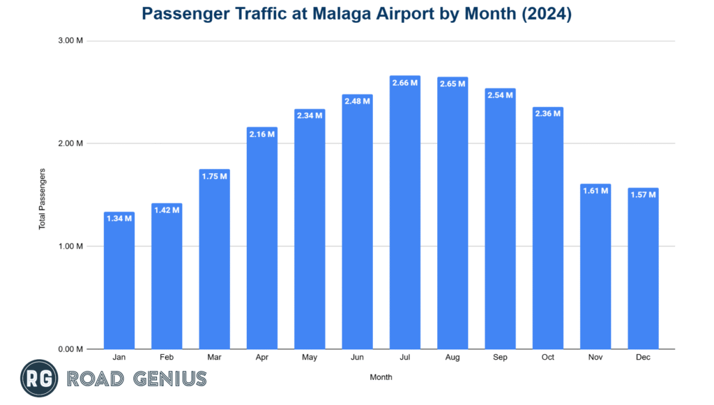 Málaga Airport sees strong seasonal fluctuations. Peak activity occurs during the summer months, though there is increasing demand in shoulder seasons.