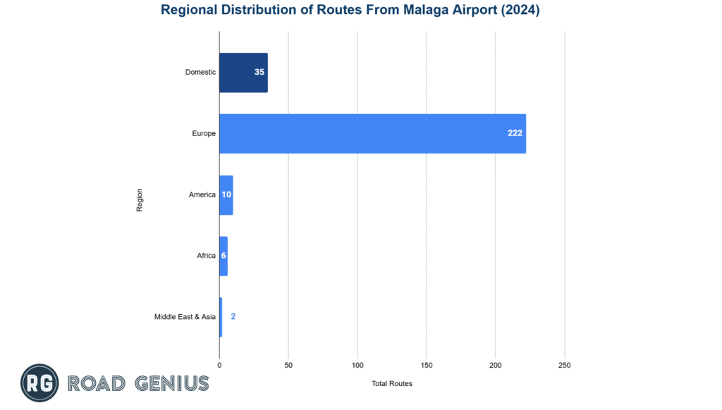 - Malaga Airport served 275 routes in 2024, an increase from 253 routes in the pre-pandemic year of 2019.