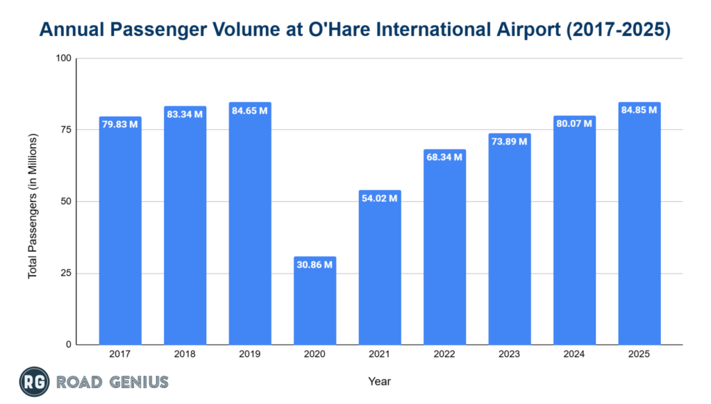 - Chicago O’Hare International Airport (ORD) handled 84.85 million passengers in 2025, a 6.0% increase from 80.07 million in 2024 and continuing its strong post-pandemic growth.