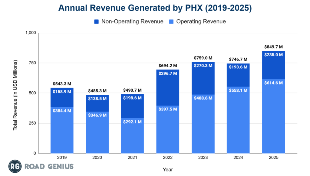 Phoenix Sky Harbor International Airport’s total revenue has grown to over $700 million annually in recent years.