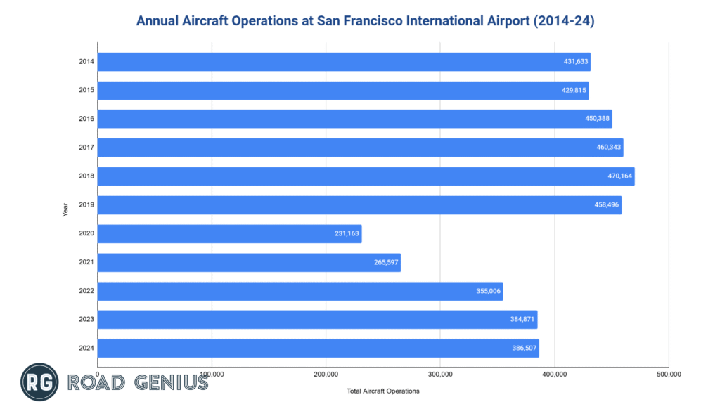 - SFO recorded 386,507 aircraft operations in 2024 , a 0.4% uptick from 384,871 in 2023.