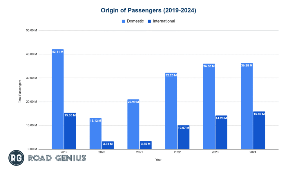 - Domestic passengers: 36.38 million in 2024, 69.8% of total traffic, up 1.1% YoY