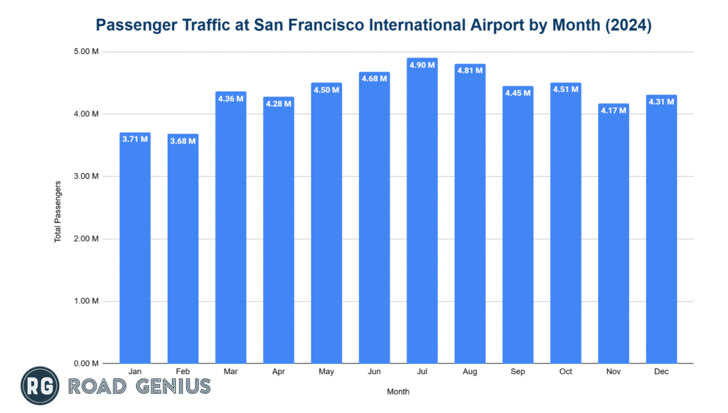 San Francisco International Airport shows clear seasonal trends in passenger traffic and peak volumes occur during the summer months.