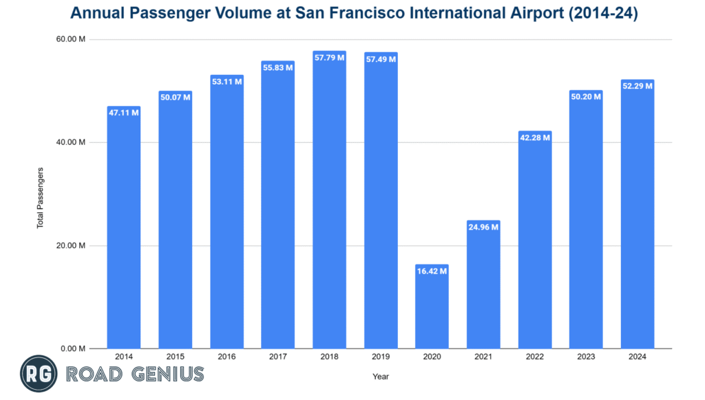 San Francisco International Airport handles over 50 million passengers annually, excluding the pandemic and recovery periods.