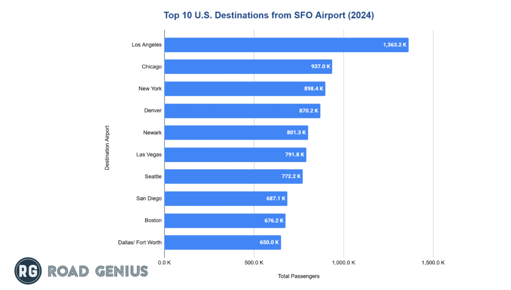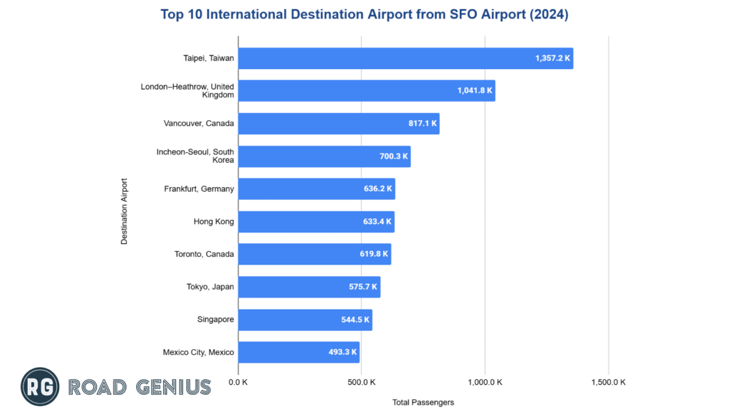 - In 2024, San Francisco International Airport (SFO)’s top international destination was Taipei, Taiwan (SJD), recording 1.36 million passengers.