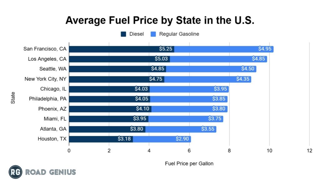 Regular gasoline costs an average of $3.42 per gallon in the U.S., while diesel costs more, totaling $3.76 per gallon in 2024.