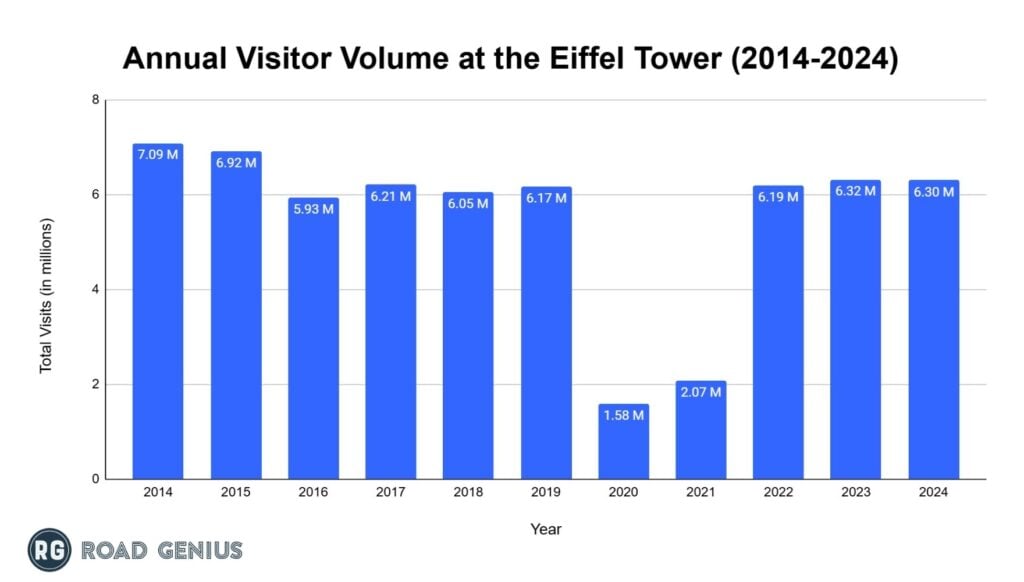 - In 2023, the Eiffel Tower attracted 6.3 million tourists, reflecting an 8% rise compared to 6.19 million visitors in 2022 and slightly exceeding the pre-COVID visitation figure of 6.2 million in 2019.