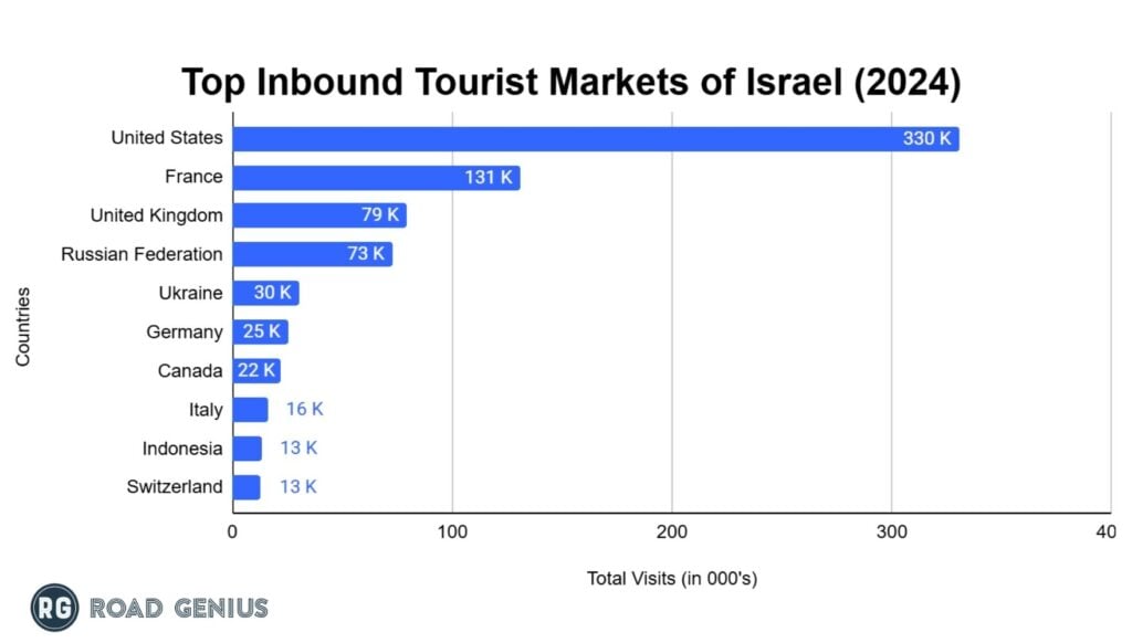 In 2024, the United States remained the largest source of foreign visitors to Israel, followed by France, the United Kingdom, the Russian Federation, and Ukraine.