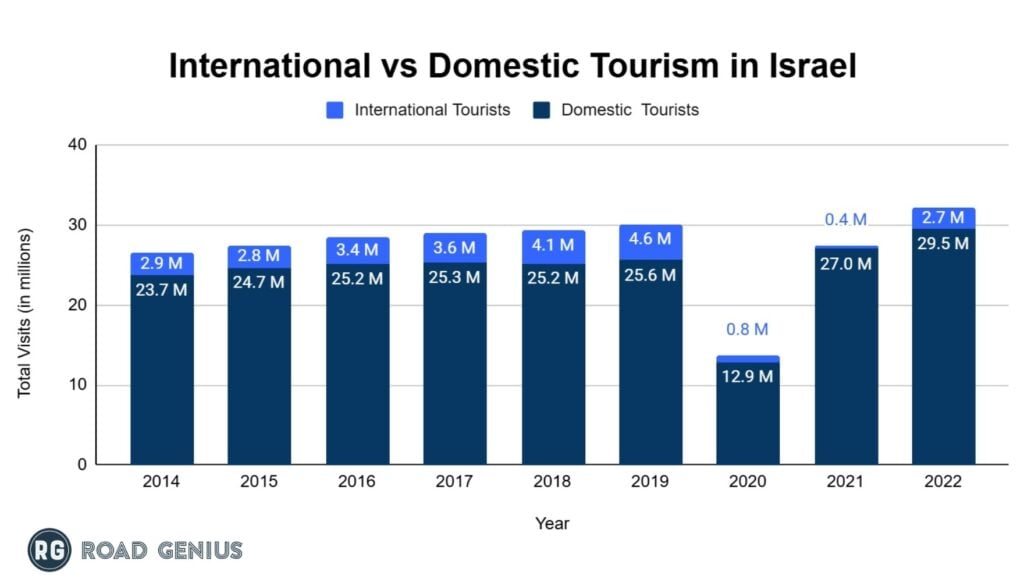 - In 2022, 29.5 million domestic visitors travelled to Israel, making up 92% of the total tourists while international tourists amounted to 2.67 million.
