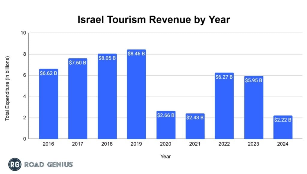 2024 saw a major decrease in tourist numbers in Israel totalling to $2.22 billion, due to security concerns and global travel advisories, directly reducing spending from foreign visitors.2