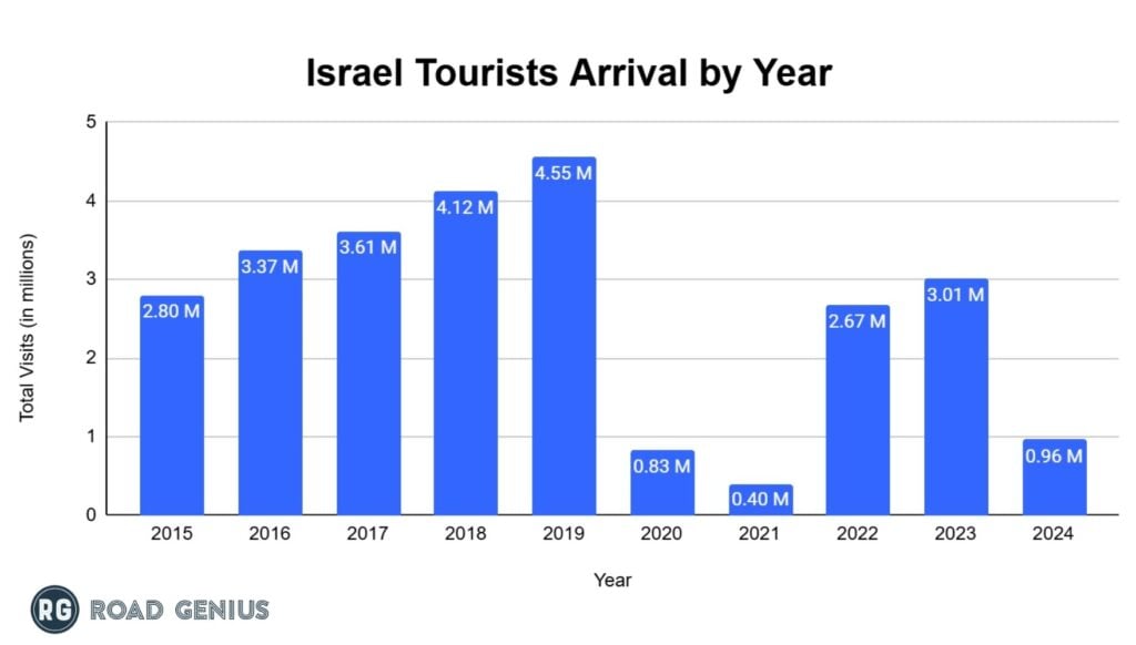 - In 2019, Israel reached a record of 4.55 million international visitors. As the COVID-19 pandemic began in 2020, inbound travel collapsed by 82%, dropping to 832,500. Tourism fell even further in 2021, reaching just 396,000 million visitors.