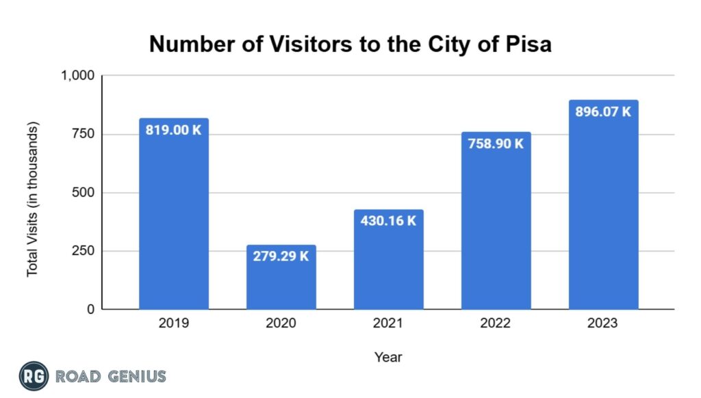 - Pisa welcomed 896,074 tourist arrivals in 2023, an 18% increase from the previous year. Overnight stays exceeded 2 million, surpassing pre-pandemic levels