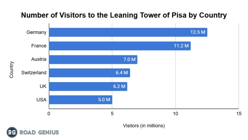 Most visitors to the Leaning Tower of Pisa come from Europe and North America, with Germany as the top tourist source in Italy, with 12.5 million German visitors in 2023.