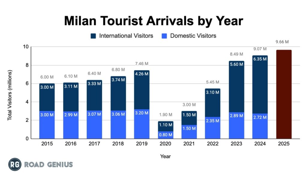 - In 2025, Milan welcomed approximately 9.66 million visitors, marking an approximately 6.5% increase over 2024.