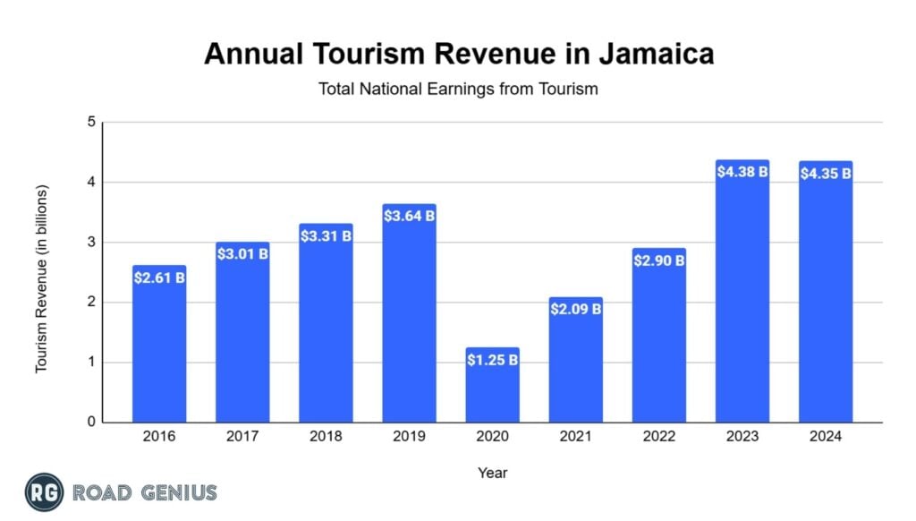 Tourists visiting Montego Bay contribute to Jamaica’s overall tourism revenue, which ranged from $2.61 billion to $4.38 billion per year between 2016 and 2024, with Montego Bay serving as the country’s main tourism hub.