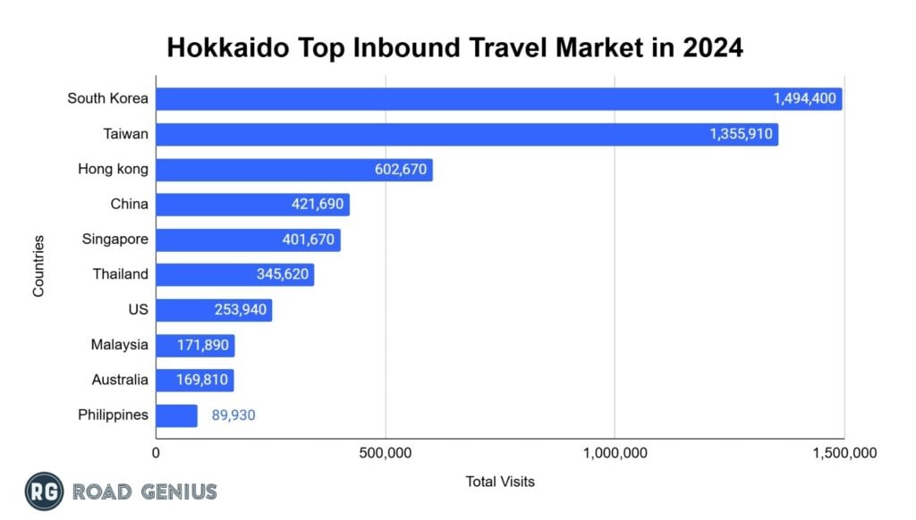 The leading sources of foreign tourists to Hokkaido are South Korea, followed by Taiwan, Hong Kong, China, and Singapore in 2024.