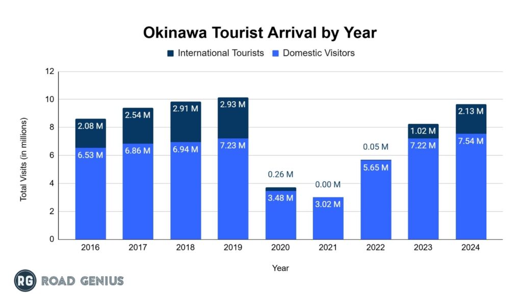- Over 9.67 million tourists visited Okinawa in 2024.Domestic tourists made up the majority of Okinawa visitors at 78% (7.54 million), while international visitors accounted for 22% (2.13 million) of total tourists in 2024.