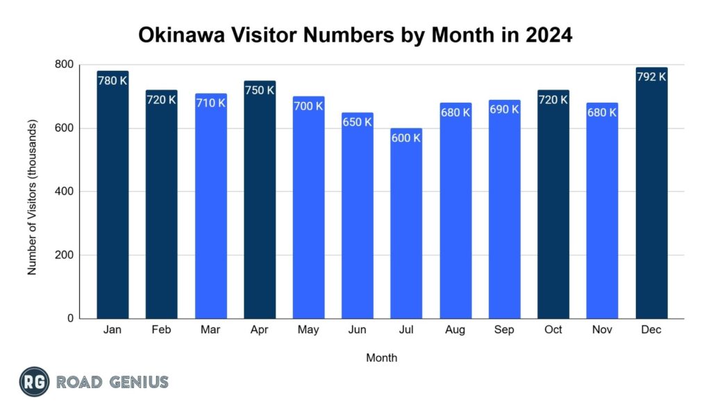 August and July are the peak tourist months in Okinawa tourism in 2024.